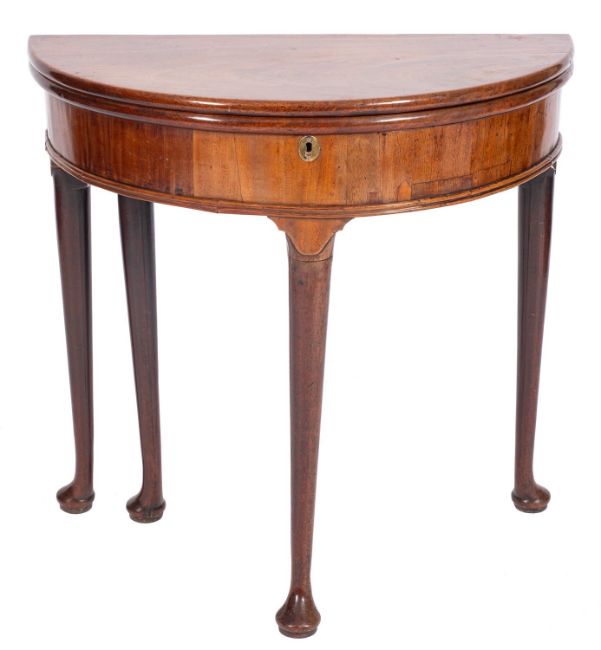 A George II mahogany half round tea table, with a hinged top and box interior, on hipped tapered legs, terminating in pad feet, 76cm across, 73cm height, 38cm depth.