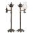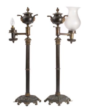 A pair of George IV or William IV patinated and parcel gilt bronze table oil lamps, circa 1830; each with a twin handled urn form reservoir with flambeau finial; the handles rising from Bacchic masks; with horizontal arms to the burners, later fitted for electricity, one with later glass shade; on cluster column shafts to openwork octagonal bases with Gothic tracery; on scrolling foliate feet; 81cm high