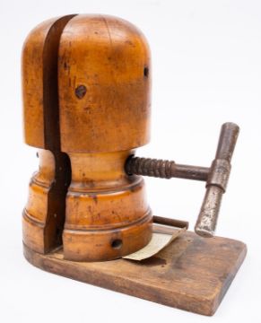 A Victorian beech and iron mounted milliner's hat stretcher, last quarter 19th century; of domed form, waisted at the screw adjustment; the shaped base with applied ivorine size gauge; 32cm high, 29cm wide