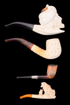 Four Austrian meerschaum pipes, late 19th century; comprising an example with bowl modelled as a Saracen's head, 17cm long; an example with stylised floral modelling to the bowl; an example with dogs modelled to bowl and stem; and another; the latter three cased