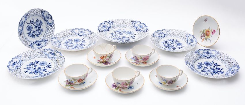 A group of Meissen tableware, comprising six saucers and five cups [one badly damaged] each enamelled with colourful blooms, together with six pierced plates painted in blue in the Onion pattern [glue repairs to one].
