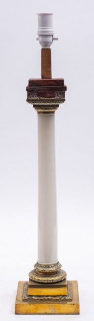 A Victorian milk glass and metal mounted columnar table lamp, late 19th century and adapted for electricity; late 19th century and later; with foliate cast socle and stepped base; 66cm high including modern fittings