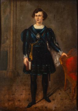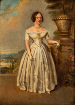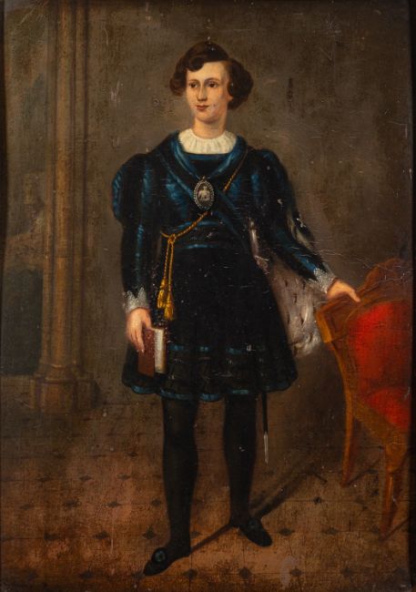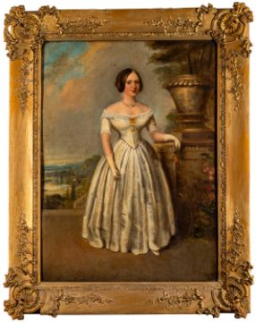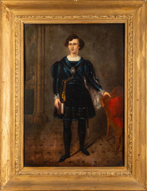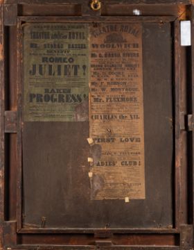 British School, 19th Century -Portraits of theatre actors Mrs Catherine Bassil and Mr George Bassil Rivers, in costume -Pair of oils board -78 x 57cm and 73 x 52cm respectively - 100 x 80cm and 96 x 76cm framed respectively -Theatre Royal Gloucester advertisements for 'Charles the XII' (1850) and 'Romeo and Juliet' (1851), in which George Bassil Rogers performed, attached to the backing of Catherine Bassil's painting (2)