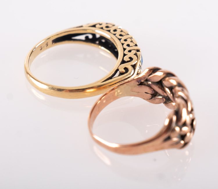 Two 9ct gold rings, including an early 20th century 9ct rose gold woven designed ring, UK hallmark, size H, 3.1grams; and a 9ct yellow gold sapphire and diamond ring, UK hallmark, size K1/2 to L, 2.8grams, (2).