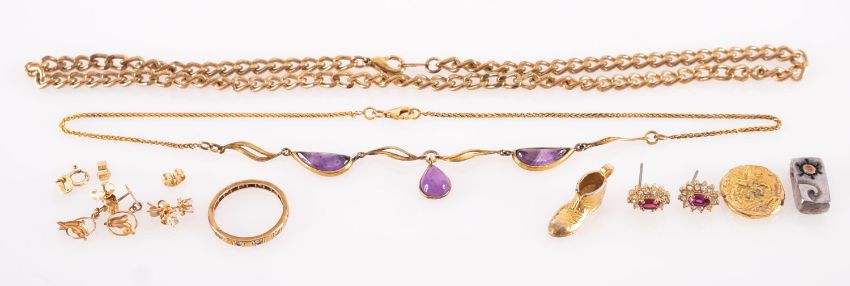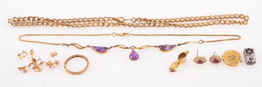 A mixed group of jewellery, including a necklace set with purple stone cabochons, marked to bolt ring 925, length approx. 42.0cm (inc. drop), 6.2grams; a rectangular shaped pendant with a swirl & sun design, marked to verso 999 & indistinct makers mark, length approx. 1.6cm, 6.9grams; a costume jewellery curb chain; a pair of costume jewellery cluster stud earrings (no backs); a costume jewellery boot charm and a coin; an eternity style ring set clear paste stones, (stones missing/damaged), marked 375, size P1/2, 2.2grams; two pairs of stud earrings, butterflies marked 9ct or 375, two spare butterflies marked 9ct or 375 and a bolt & jump ring fitting, the jump ring UK import mark for 375, total gross weight 1.7grams, (Qty).