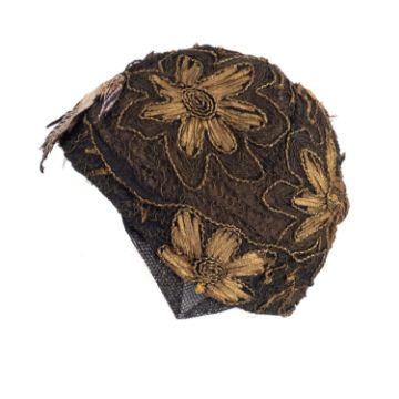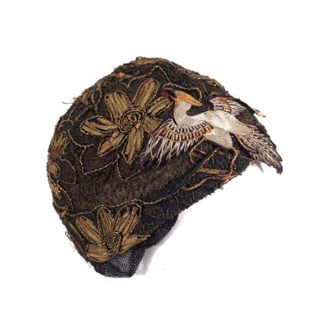 An early 20th century silk and gilt embroidery Cloche hat, possibly French, circa 1920s the gilt floral embroidery with Phoenix bird on a brown cotton ground with cotton lining, together with a collection of bead work sections, a bead work belt, two pairs of white kid gloves , a Victorian silk panel and other textiles.