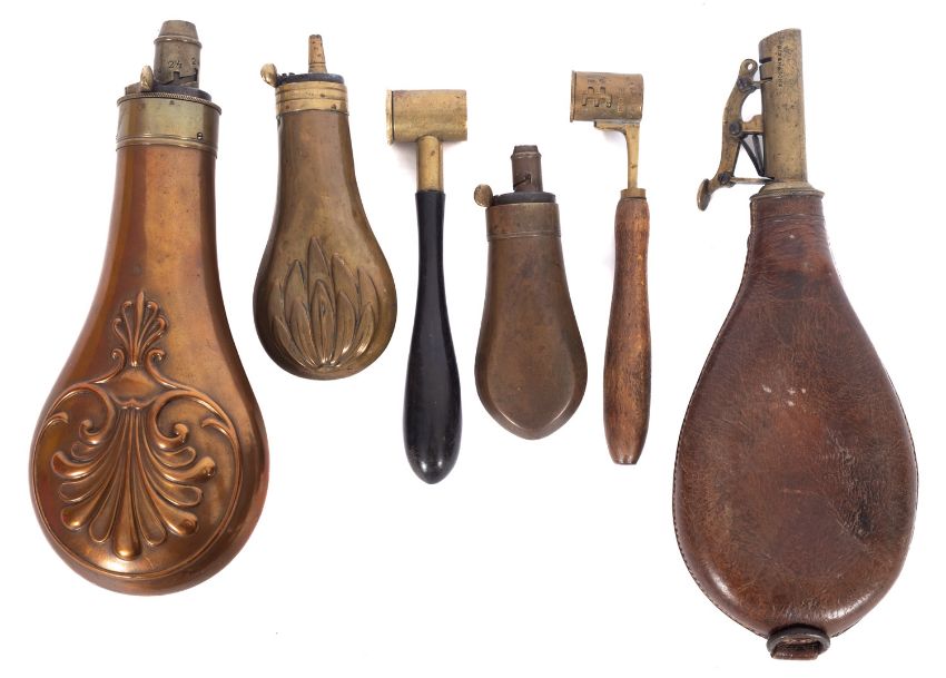 Two 19th century copper pistol powder flasks, unsinged, together with a larger copper powder flask, a leather shot pouch and two dram measures (6)