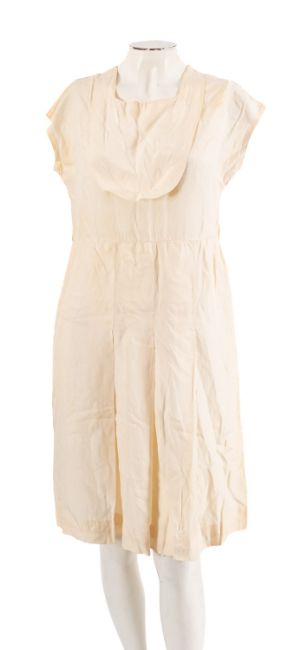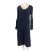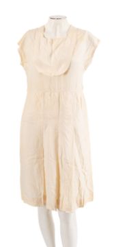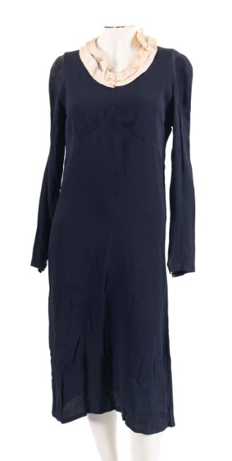 A group of three vintage dresses, including a 1910s block-print house dress, a 1930s navy day dress in rayon crepe and floral silk collar, with a 1930s bib-front tennis dress. (3)