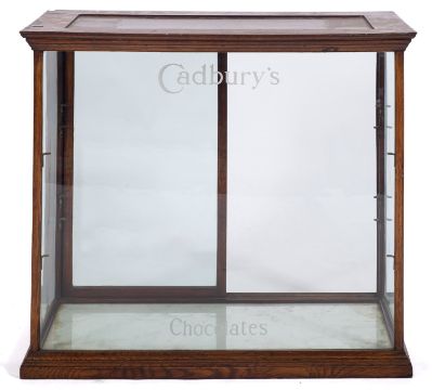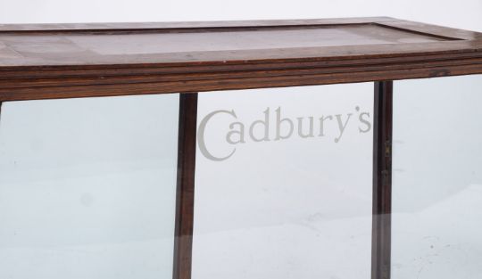 An early 20th century mahogany and glazed 'Cadbury's' shop counter display cabinet, the glazed front with gilt lettering with double glazed sliding doors to rear enclosing two glass shelves, 70.5x82 x 43cm