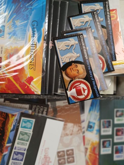 Great Britain stamps, presentation packs, covers, in storage container.