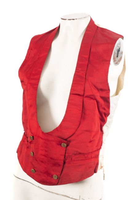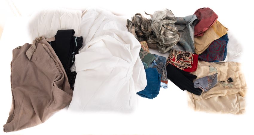 A quantity of various textiles , including a red silk waistcoat, a black and white striped dress, pocket squares etc.