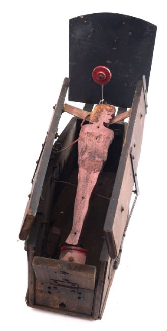 An early 20th century fairground shooting gallery target in the form of a coffin, the steel backplate with red circular target over double door coffin revealing a spring loaded painted wooden figure of a nude female, 59cm long 45cm high.