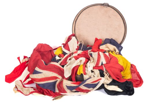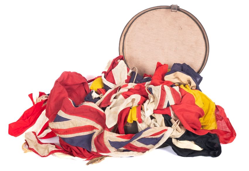 A collection of signal and other flags, including two Red Ensigns and a Stars & Stripes.