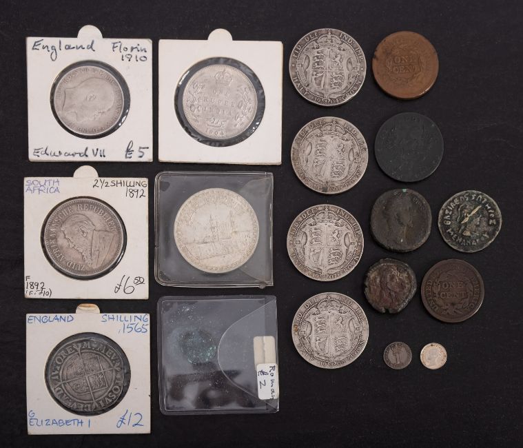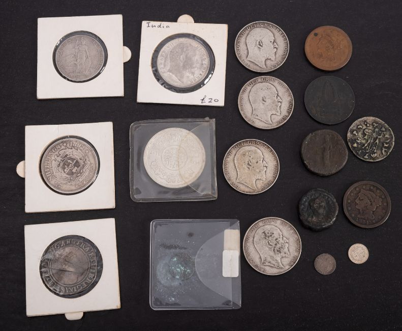 Edward VII halfcrowns 1904,09, a 1910 florin, with a 1904 Indian rupee, 1892 half crown, Edward VI shilling, with 1853 and 1800 silver pennies, Roman etc.