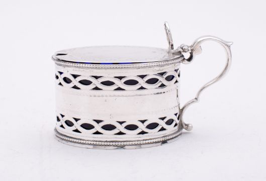 A Victorian silver and glass mustard pot by Henry Holland, London 1874, of oval form, the hinged lid with pieced thumb piece, S scroll handle, pieced body and beaded rim, 7.5cms. (2.9ins) high, 127gms. (4ozs.), with blue glass liner