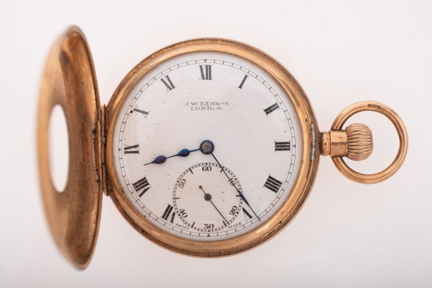 J.W. Benson, a 9ct gold half-hunter pocket watch the white enamel dial having black Roman numerals, a subsidiary seconds dial, blued-steel moon hands and signed J.W. Benson, London, the movement having engine-turned decoration to the silvered backplate, an overcoil Breguet hairspring to the lever escapement and stamped Swiss Made, the case and inner cuvee hallmarked for 9ct gold, Birmingham, 1926 along with the initials A.L.D. for the Dennison Watch Case Company, formerly Aaron Lufkin Dennison of Handsworth, Birmingham, diameter 48mm, gross weight approx. 94.65gs.