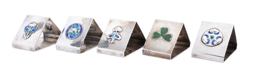 A set of five Arts and Crafts silver and enamel napkin rings by E Jacobs & Son, Birmingham 1905, of triangular form, 183gms. (5.9ozs.), gross, (5)