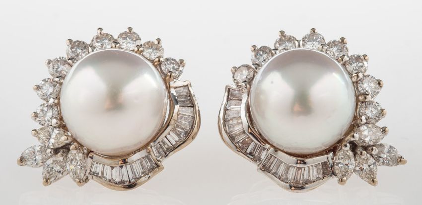 A pair of South Sea pearl and diamond earrings, each set with a South Sea pearl, measuring approx. 11.80mm, with a surround of baguette-cut, brilliant-cut and marquise-cut diamonds, diamonds approx. 2.60 carats total, post and butterfly fitting (one butterfly missing), earrings unmarked, one butterfly marked 750, length approx. 22.0mm, 14.8grams.
