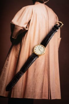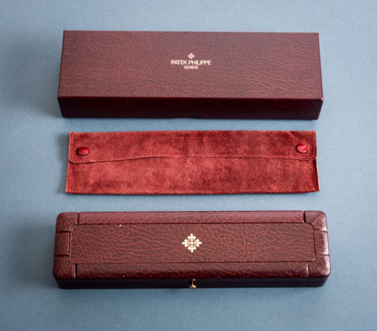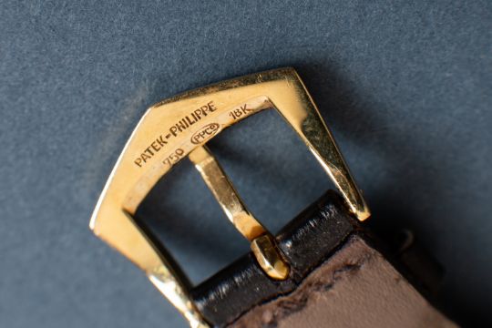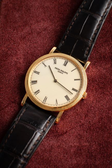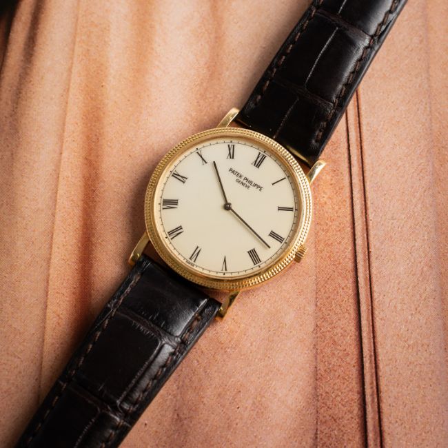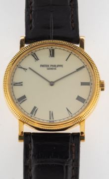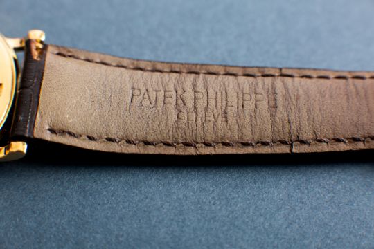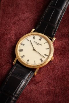 Patek-Phillipe a gold Calatraver gentleman's wristwatch the case having a milled edge bezel and marked with a gold import stamp, with the inside of the case marked Patek-Phillipe, Geneve, Swiss, 18K, 750 along with the serial number 2985014 and model number 3520/D, the cream dial with black Roman numerals, blued-steel baton hands, and signed Patek-Phillipe, Geneve, the movement stamped Patek-Phillipe & Co., Geneve, along with the serial number 1378450 and calibre number 177, the clasp to the black crocodile strap marked .750, 18K, Patek-Phillipe, PPCo., complete with burgundy inner and outer boxes and stamped plastic slip cover, diameter 32mm.