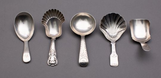 A group of silver tea caddy spoons including; an Old English pattern with pear shaped bowl spoon by John Lias, London 1807, a Bright-cut round bowl spoon by George Turner 1810, a Fiddle pattern shell bowl spoon by JC, Birmingham 1861, a Kings pattern shell bowl spoon marks poorly struck and a shovel bowl spoon by E.J?, Birmingham 1791, 62gms. (2ozs.), gross, (5)