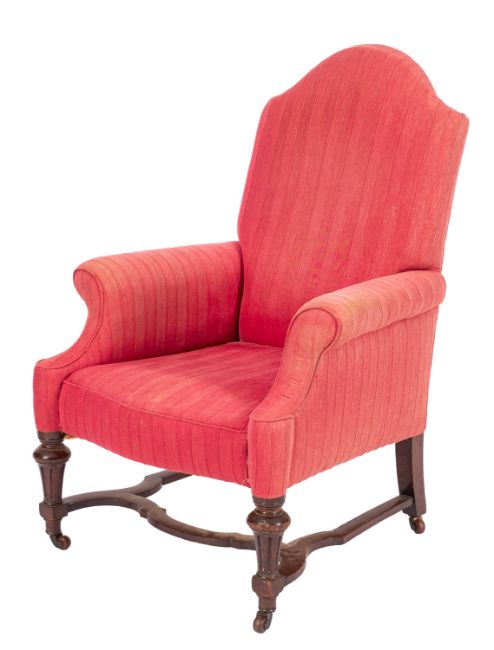 A Victorian upholstered armchair in Queen Anne taste, late 19th century,cerise upholstered, with arched back and outscrolled arms; on turned and fluted legs with 'H' stretchers and ceramic castors; 108cm high, 74cm wide