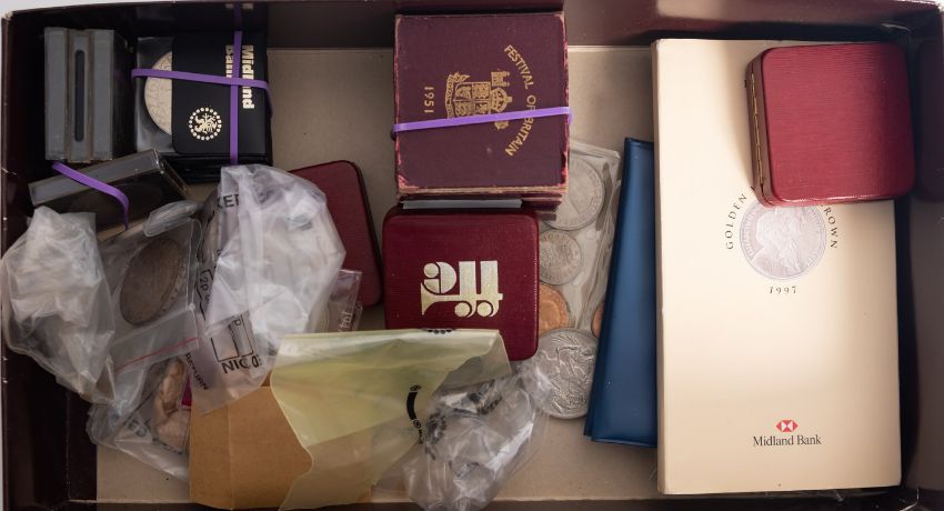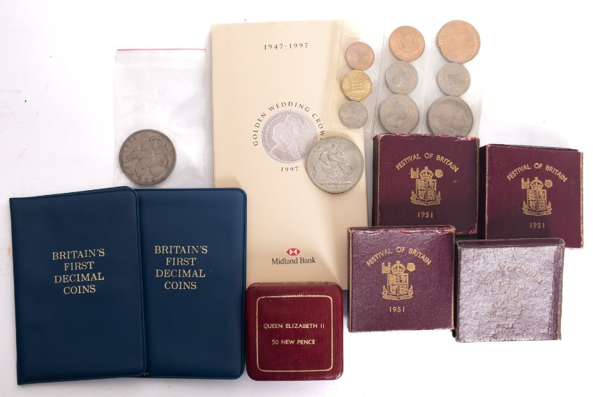 A box of mixed British coins, including crowns, four 1951, four 1953, 1953 plastic set, etc.