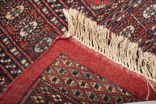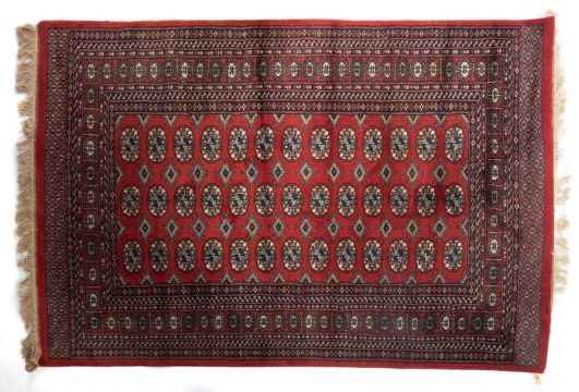 A Pakistan rug, the rose field with three rows of quartered guls, enclosed by a stellar panel border, 189cm x 129cm.