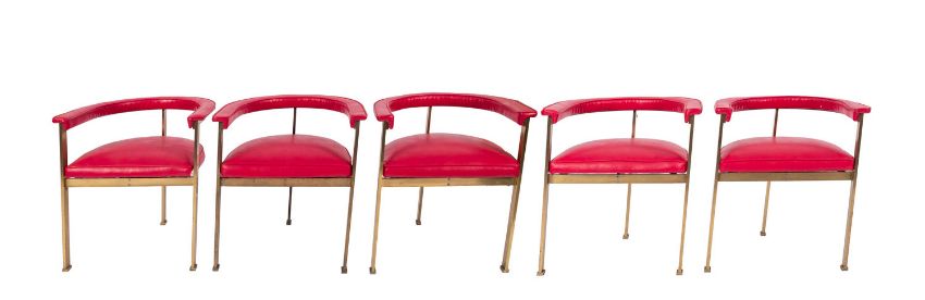 A set of five bronze alloy and upholstered side chairs, circa 1980s; with faux red leather covered hoop backrests and seats, each on three straight legs to block feet; 71cm high, 64cm wide PROVENANCE: By repute, previously in the Reception at Asprey of London]