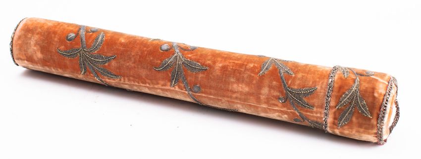 An ochre velvet and white metal wirework document case, possibly Ottoman, early 19th century; of tubular form with entwining foliate decoration; 45cm long