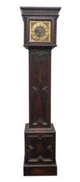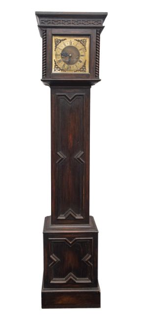 An oak cased chiming miniature longcase clock having an eight-day duration movement striking the hours and chiming the quarters on four gong rods, the seven-inch square brass dial having a raised chapter ring with black Roman numerals, the flat-top oak case with barley-twist columns to the hood and shaped panelling to the trunk and base, height 154cm.