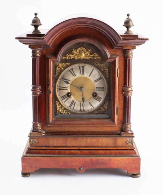 Hamburg American Clock Co., a 14-day mantel clock the movement with cross-keys trademark and striking the hours on a gong, the break-arch dial with black Roman numerals and blued steel hands, the case having a curved top, fluted columns, with brass finials and mounts, inside the rear door having pasted trademark for H.A.C. and serial number 3115, height 35.5cm.