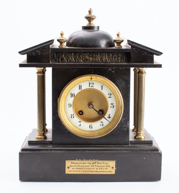 Richard et Cie, Paris a black slate mantel clock the eight-day duration mnovement striking the hours and half-hours on a gong with the back-plate stamped with theentwined serpent trademark for Richard et Cie and numbered 3655, the gilt-brass dial having an ivorine chapter ring with black Arabic numerals, and blued-steel spade hands, the black marble case with fluted brass pillars to the four corners, a shaped pediment top with classical bronzed frieze and presentation plaque dated 1906, height 32cm.