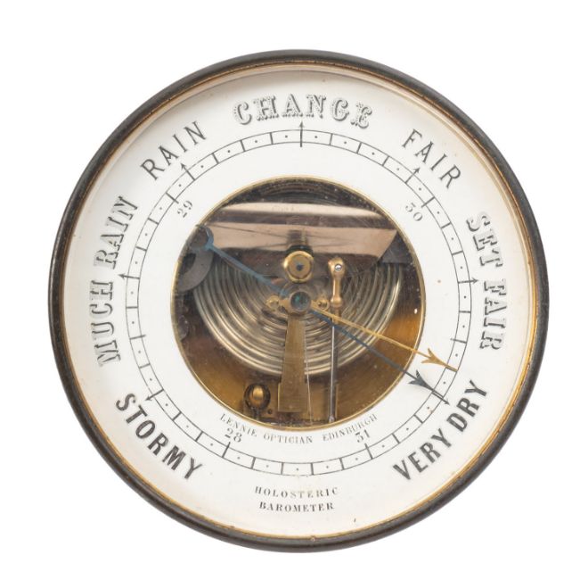 An early 20th century brass aneroid barometer for 'Lennie Optician. Edinburgh', central visible drum and mechanism surrounded by a calibrated dial, 17cm diameter