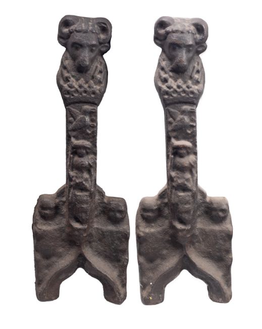 A pair of substantial cast iron andiron fronts in 17th century taste, 19th century; with aegicranial finials, the shafts with figures cast in relief; lacking billet bars; 89cm high