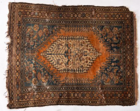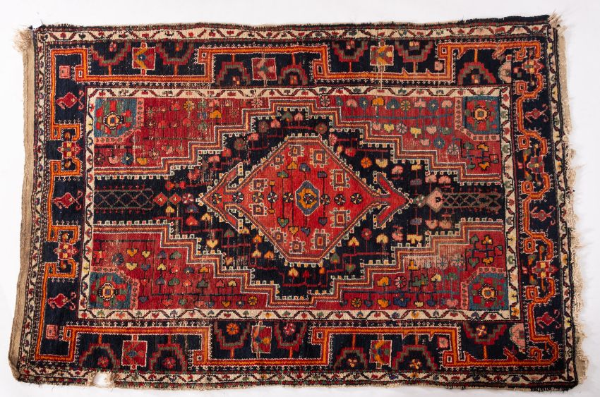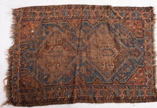 A Caucasian rug, the indigo field with a central rose hexagonal pole medallion, rose spandrels and indigo border, 185cm x 128cm, a Shiraz rug and one other (3) (damage and wear).