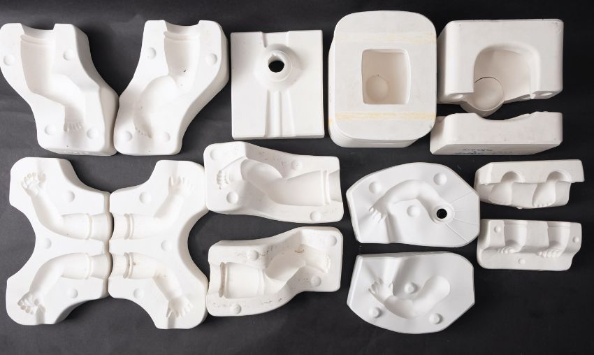 A collection of various plaster doll moulds.