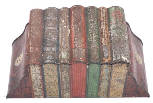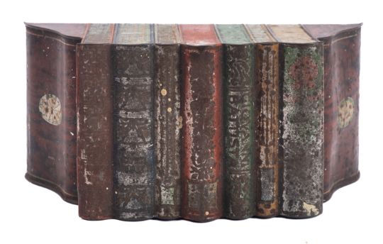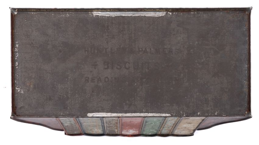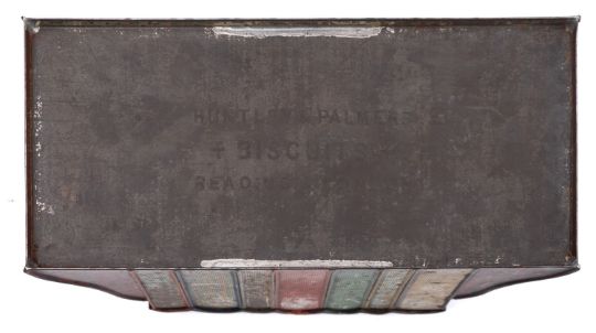 A Huntley & Palmer biscuit tin in the form of seven books between book ends, colour litho printed, 22cm long
