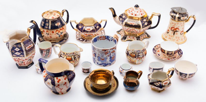 A group of Imari decorated pottery and porcelain, including a First Period Worcester Queen Charlotte cup, fretted square mark, two Derby porcelain jugs, [repaired], a Masons Ironstone hydra mug and other items, some faults.