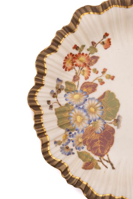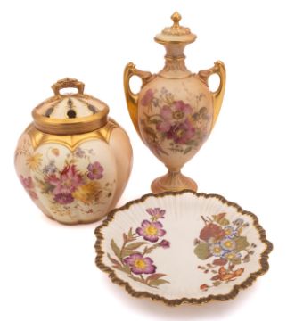 Two pieces of Royal Worcester blush ivory porcelain, comprising a melon shaped jar and pierced cover, printed and enamelled with blooms, puce marks and date code for 1917, 20cm high; a two handled pedestal vase and cover similarly decorated, puce marks and date code for 1896, 27cm high, together with an ivory ground feather edged plate with two sprays, puce marks and date code for 1887, 22cm diameter. [3]