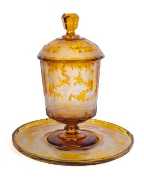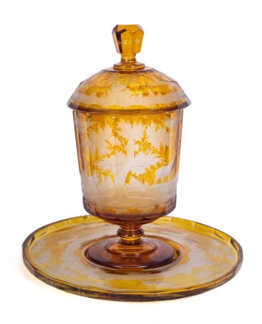 A large Bohemian amber flashed glass punch bowl, cover and stand facet-cut and engraved with continuous scenes of deer in wooded landscapes, 19th century, diameter of stand 38cm.