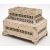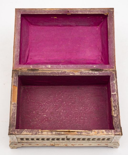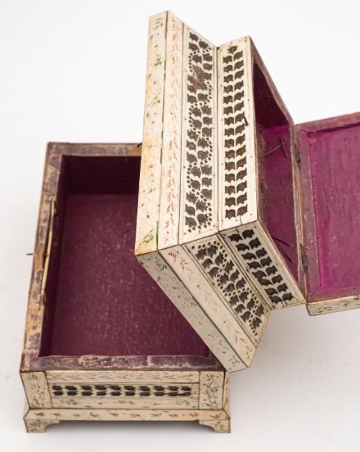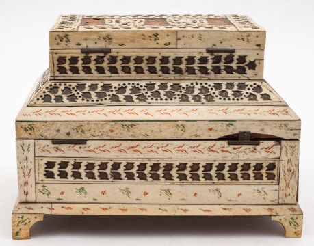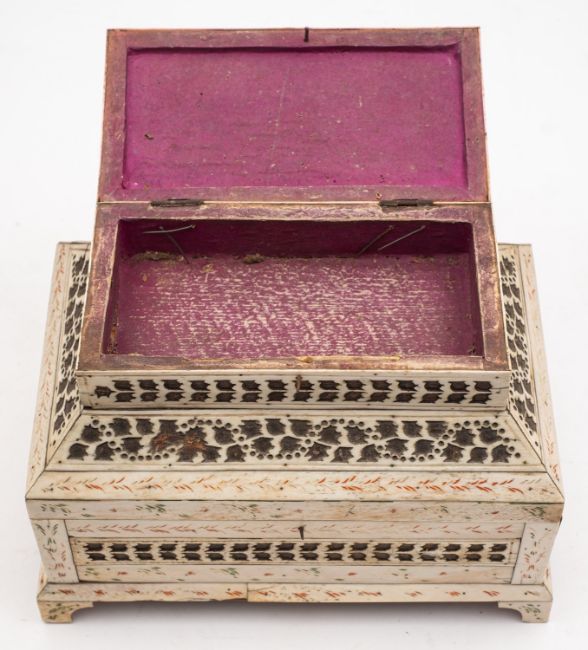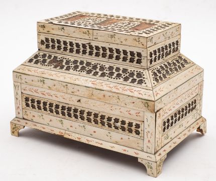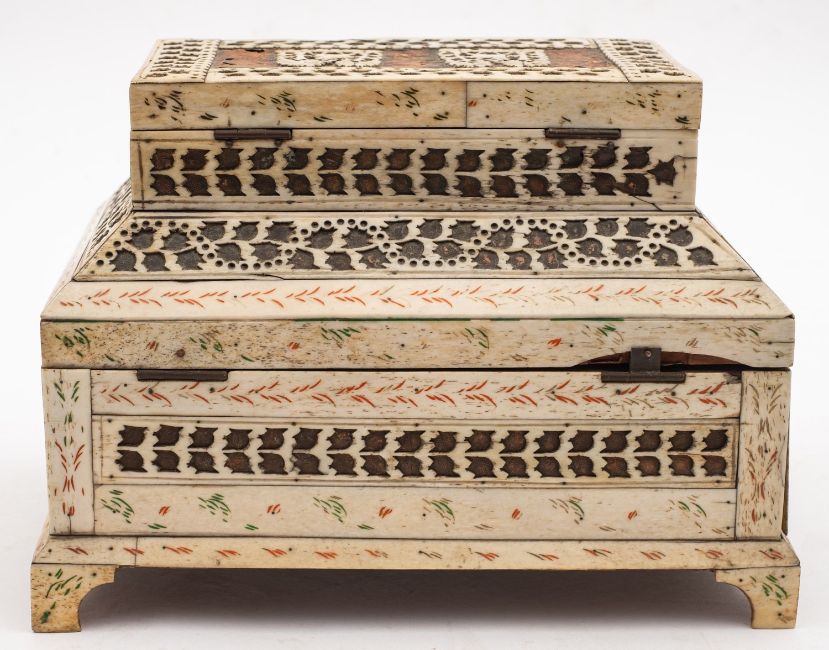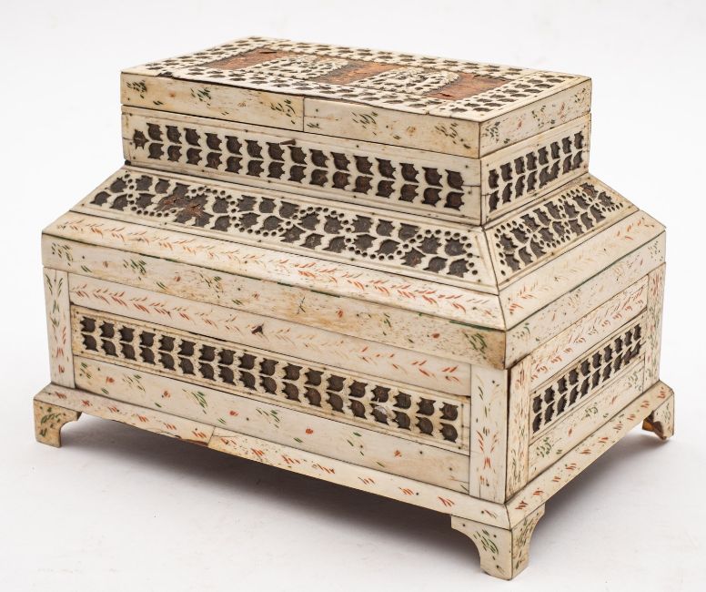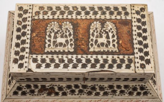 A Russian Kholmogory penworked whalebone casket, Archangel region, late 18th /early 19th century; two tiered, with a hinged cover to a subsidiary upper section, itself hingeing open to the main compartment; the top with twin panels depicting reindeer in trees, with stylised cut bone bands and red and green detailing, on bracket feet; 16cm high, 23cm wide
