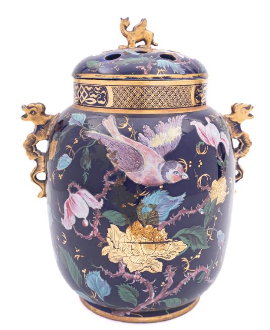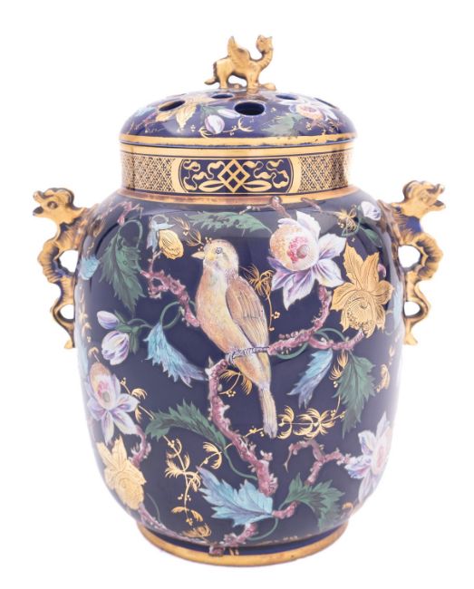An early 19th century Ironstone pot-pourri vase and cover, probably Mason's with dragon handles, enamelled and gilded with birds amongst flowering branches on a deep blue ground, circa 1830-40, 24cm.