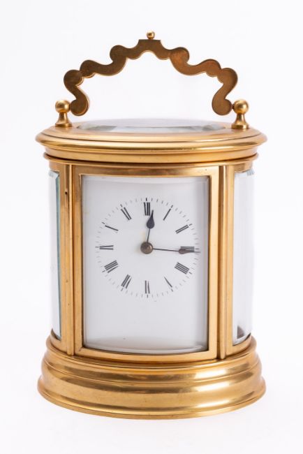 A French late-Victorian oval brass carriage clock the eight-day duration movement having a platform cylinder escapement and striking the hours and half-hours on a bell, the white enamel dial having black Roman numerals and blued-steel spade hands, the oval case with a c-scroll handle, height 17cm/14cm, handle up/down.