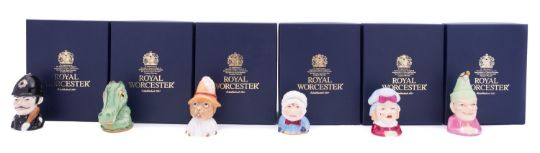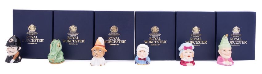 Six Royal Worcester limited edition porcelain candle extinguishers, comprising Punch, Judy, Baby, Policeman, Toby and Crocodile each numbered 173/600, with fitted boxes.
