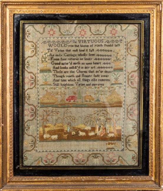 A George III needlework sampler, dated 1804; with virtuous text above a depiction of cattle grazing; above a scene with a shepherd and shepherdess amongst sheep, with overhanging trees; all within a border of trailing stems and flowers; indistinctly name embroidered for 'Elizabeth S... S..., Finished July 1804'; beneath an eglomise edged glass and with gilt composition frame; 53 x 46cm overall