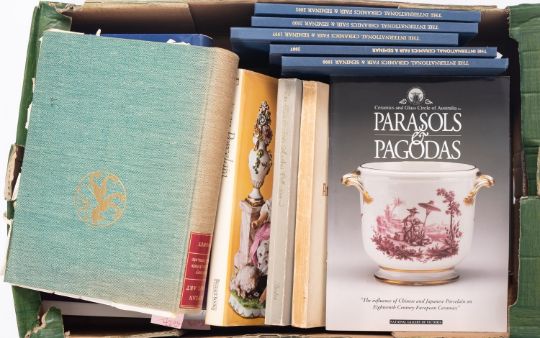 CERAMICS. ERIKSEN, Svend and Geoffrey de Bellaigue. Sevres Porcelain: Vincennes and Sevres 1740-1800, Faber & Faber 1987, cloth, dj, 4to; AYERS, John et al. Porcelain for Palaces: The Fashion for Japan in Europe 1650-1750, London 1990, cloth, dj, 4to; HONEY, William Bower. European Ceramic Art from the ends of the Middle Ages to about 1815, illustrated Historical Survey, Faber & Faber 1952, cloth, remains of dustjacket, 4to; and others mainly European porcelain. (1 box)