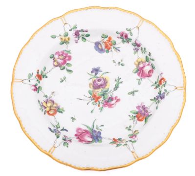 A Champion's Bristol plate painted with garlands of flowers suspended from gilt rings around a central bouquet, gilt dentil rim, blue Xb mark, circa 1775-80, 19.5cm.Provenance: paper labels for the David Lyndsay and F.B.Gilhespy collections.