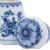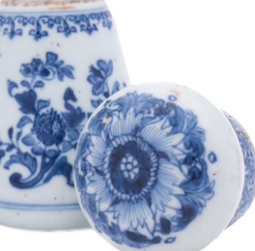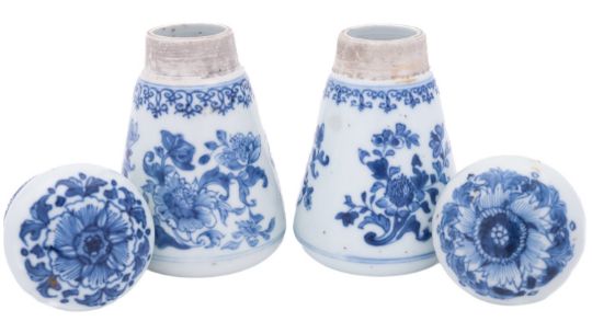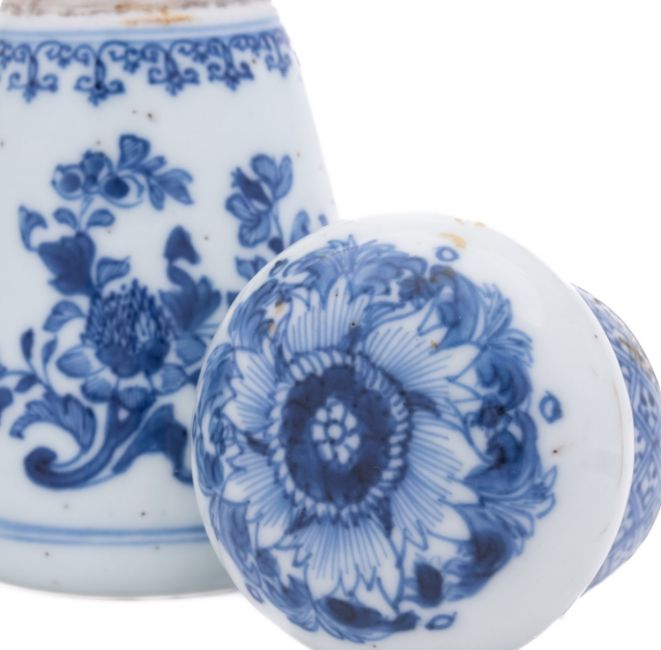 A pair of Chinese blue and white jars and covers of conical form with compressed globular covers, painted with peony, lotus and chrysanthemum sprays, Qing Dynasty, 18th/19th century, 13.5cm [differences in decoration, covers probably matched].