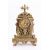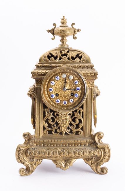 Japy Freres, a French cast-brass mantel clock the eight-day duration movement striking the hours and half-hours on a bell with the backplate stamped with the trademark for Japy Freres, the round cast-brass dial having blue Roman numerals to the white enamel roundels and decorative blued-steel fleur-de-lys hands, the cast brass case with c-scroll decoration, lions head handles to the sides, scroll feet and surmounted by a matching cast urn, height 40cm.