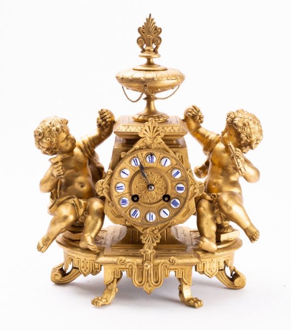 A mid-Victorian gilt-metal clock the eight-day duration movement striking the hours and half-hours on a bell and stamped for the maker Japy Frères, with the diamond shaped gilt-metal dial having individual enamel plaques with blue Roman numerals and blued-steel spade hands, the Egyptian-style figural case with classical mounts and having two putti at play to the sides, height 34cm.